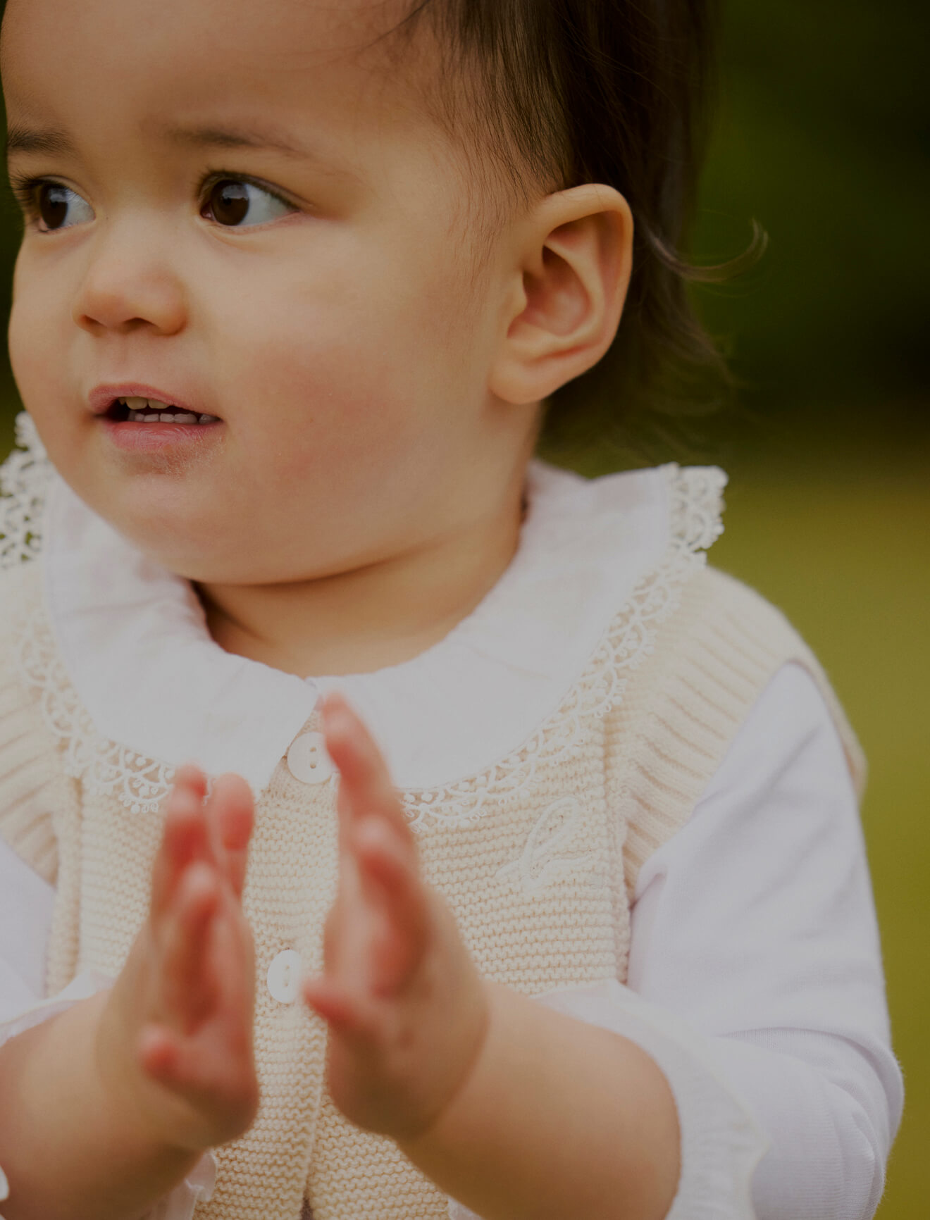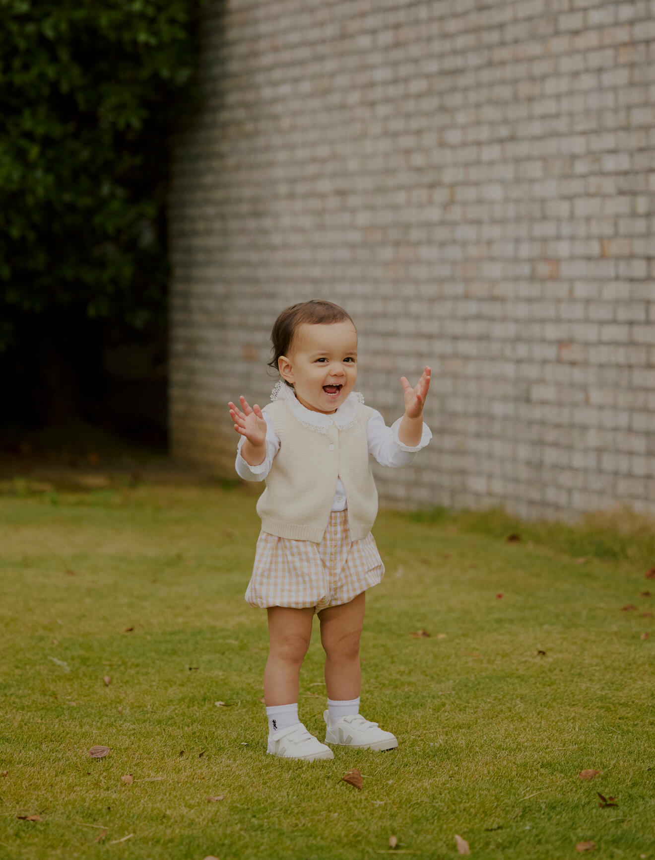 Baby: ニットベスト¥14,300 中に着たブラウス¥9,020 ブルマ¥10,450 ソックス¥1,870(以上すべてagnès b./アニエスベー)シューズ スタイリスト私物