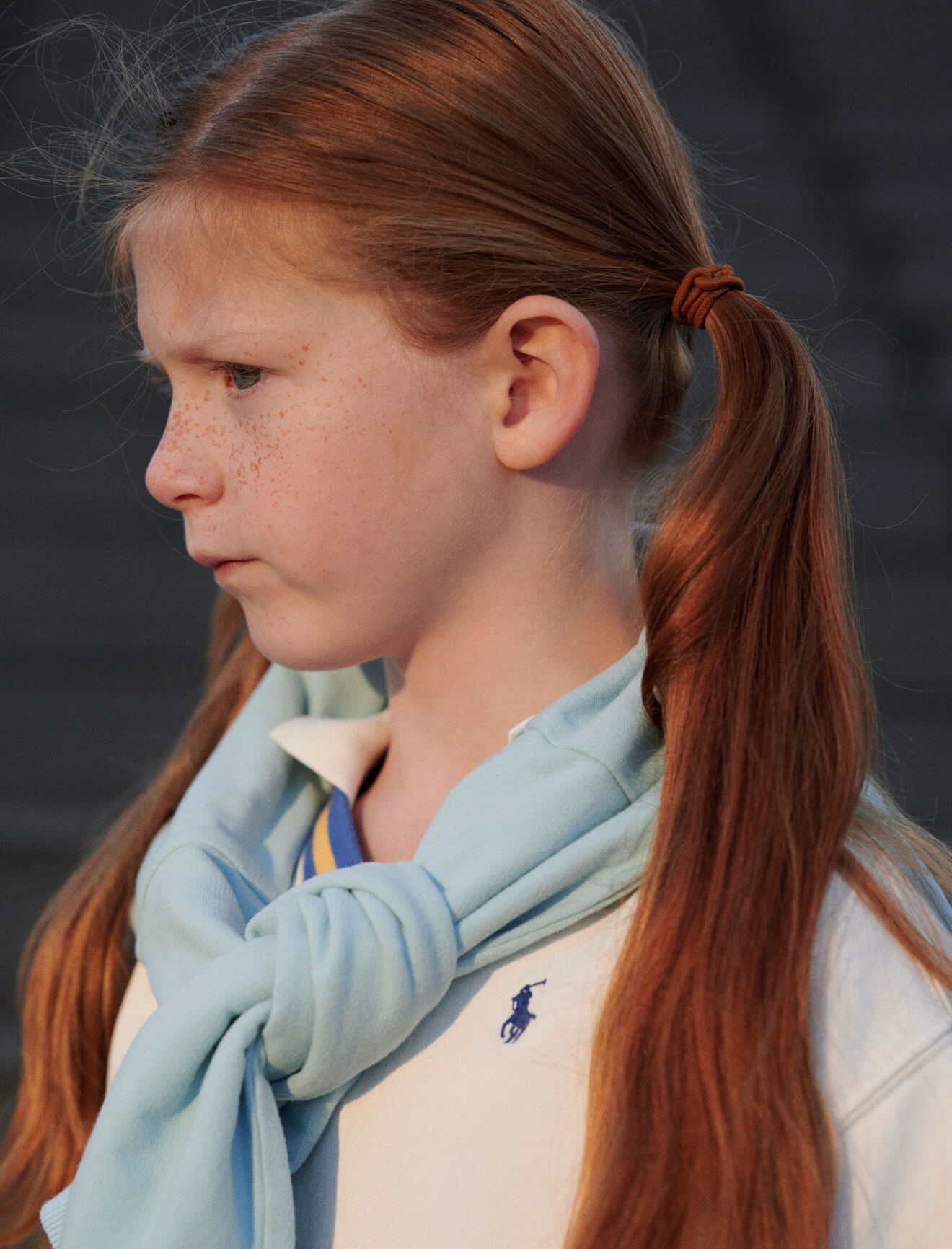 スウェットシャツ¥17,600(POLO RALPH LAUREN/ラルフ ローレン) 肩にかけたスウェットシャツ¥11,880 スウェットパンツ¥11,440(ともにWEEKEND HOUSE KIDS/ミンバ) サンダル スタイリスト私物