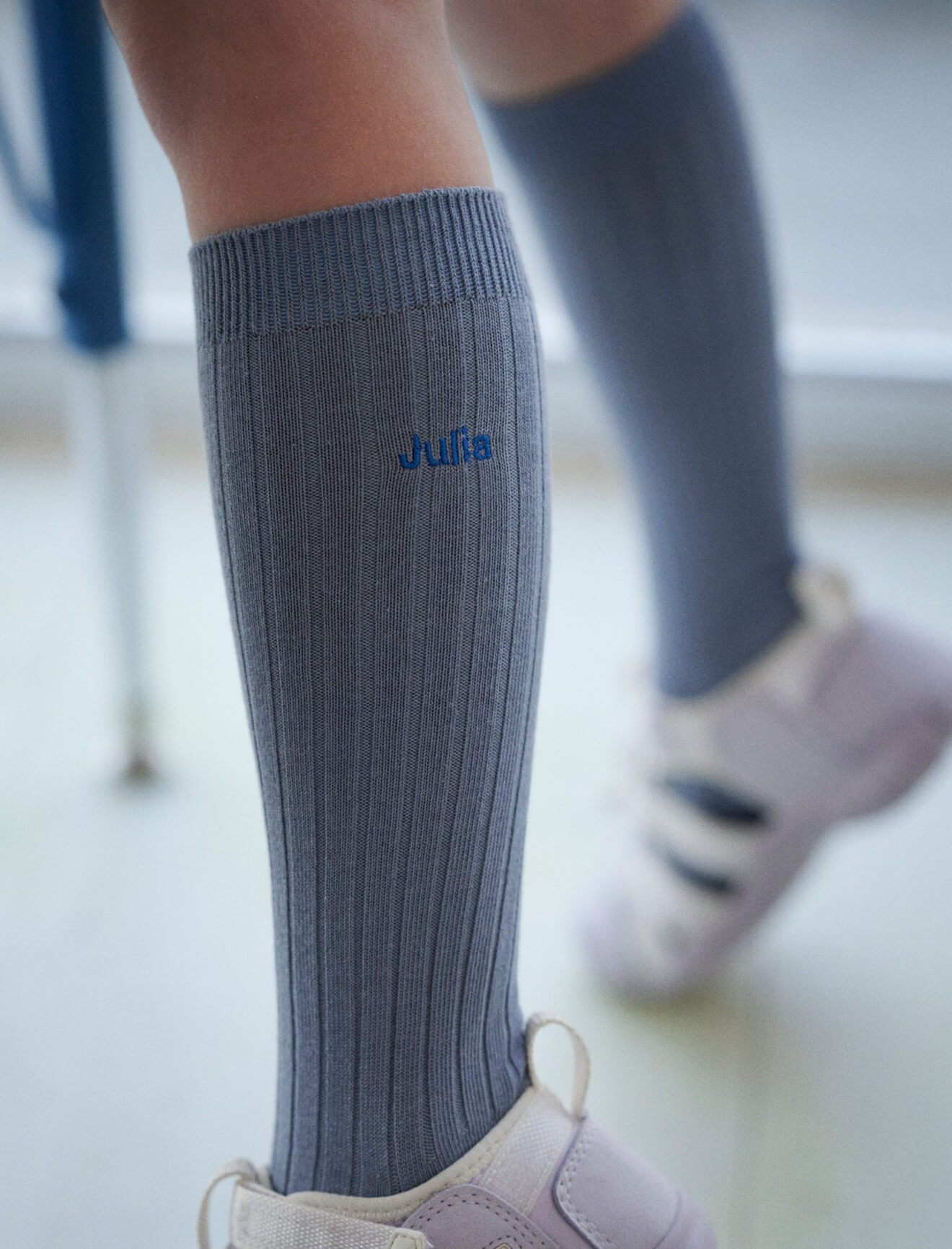リブハイソックスcol.81ダルサックス¥770+カスタム刺繍6文字以内¥220(ともにmaisonpeca/タビオ)
