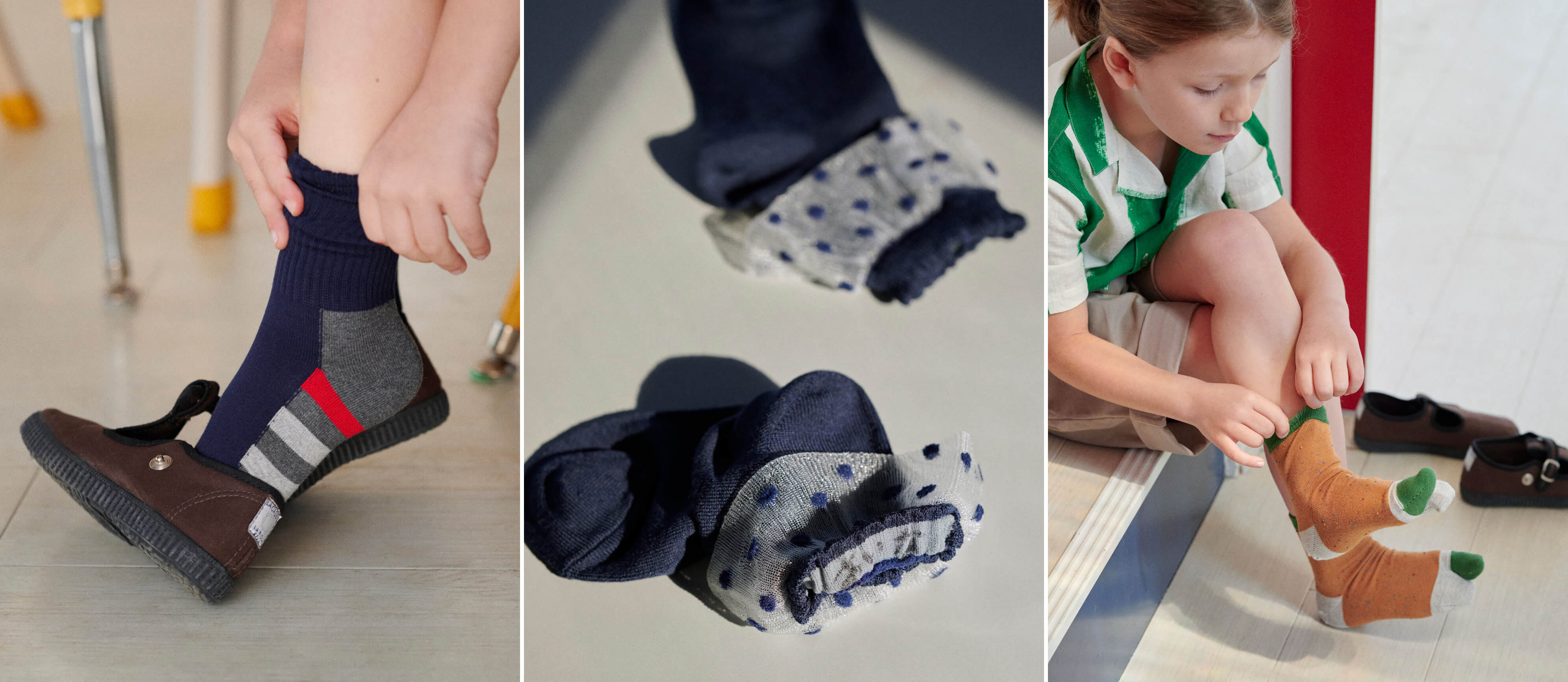 通園や通学を応援する機能的なソックスも充実。足の汚れが目立ちにくいソックスや、ゴム裏に名前が書けるソックス、正しい姿勢と歩行をサポートする足袋ソックスなど、日々を心地よくサポートしてくれる頼れるコレクション。