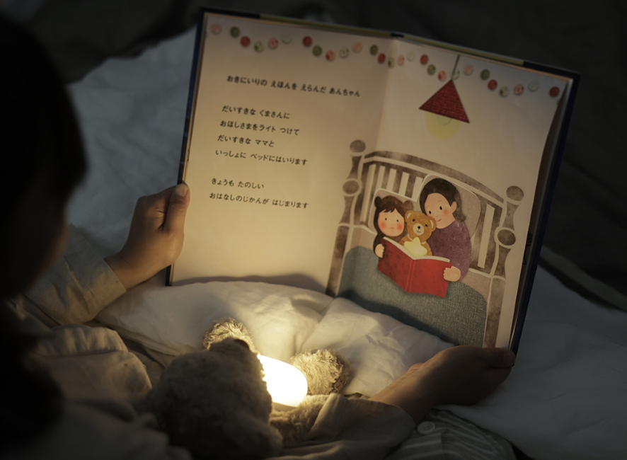 開発のきっかけは、担当者が友人から聞いた「お気に入りのぬいぐるみにライトを持たせることで、単なる読み聞かせがかけがえのない時間になるんだよ」という言葉。そこで読み聞かせ事情をリサーチしていくと、意外にも「スマホのライトを使っている」という声もあったそう。