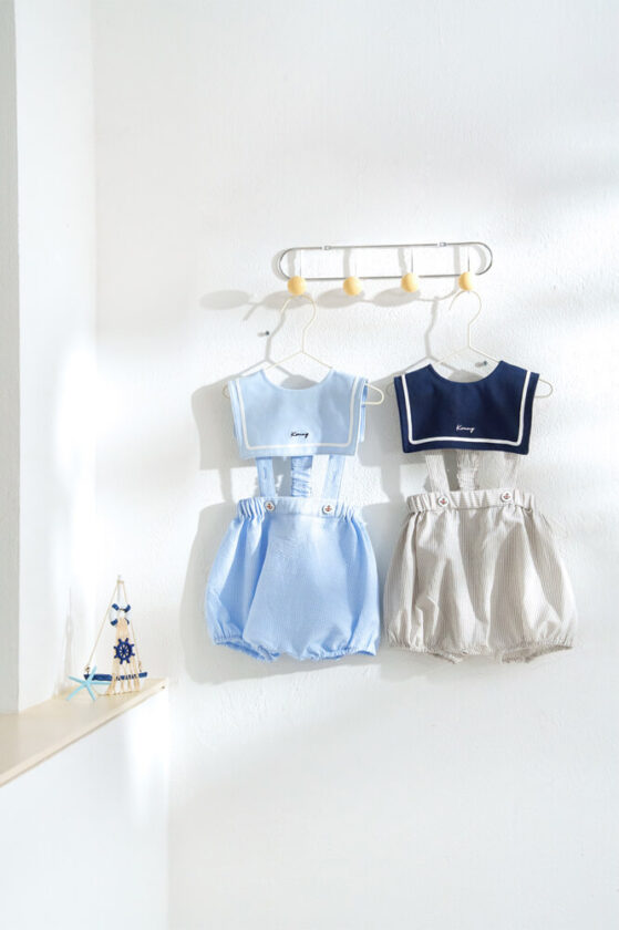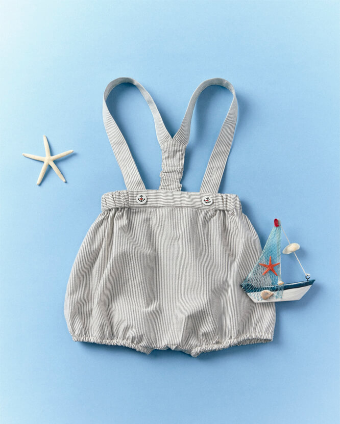 新作として登場する「マリンかぼちゃパンツ」は、ウエストにあしらわれた、いかりモチーフのボタンがアクセント。ふんわりとしたシルエットがベビーならではの愛らしさを引き立てる。取り外し可能なサスペンダー付きで、シーンに合わせた着こなしが楽しめるのもうれしいポイント。