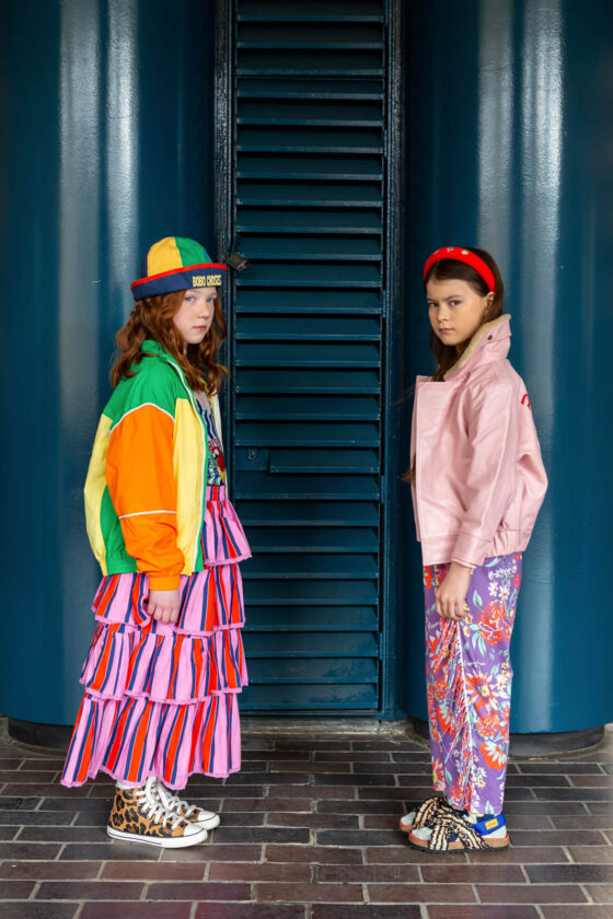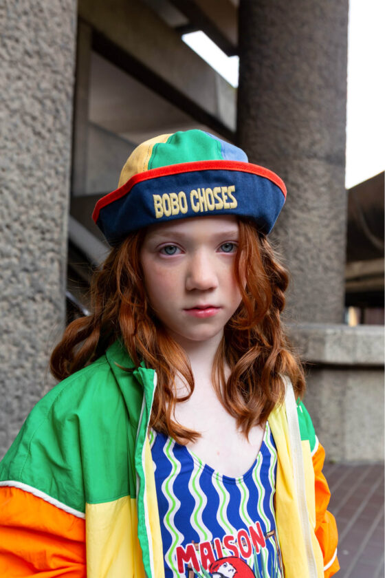 Left Girl: トップス(Maison Mangostan)中に着たトレーナー パンツ(ともにBOBO CHOSES)シューズ(Crocs)ベレー帽 スタイリスト私物
