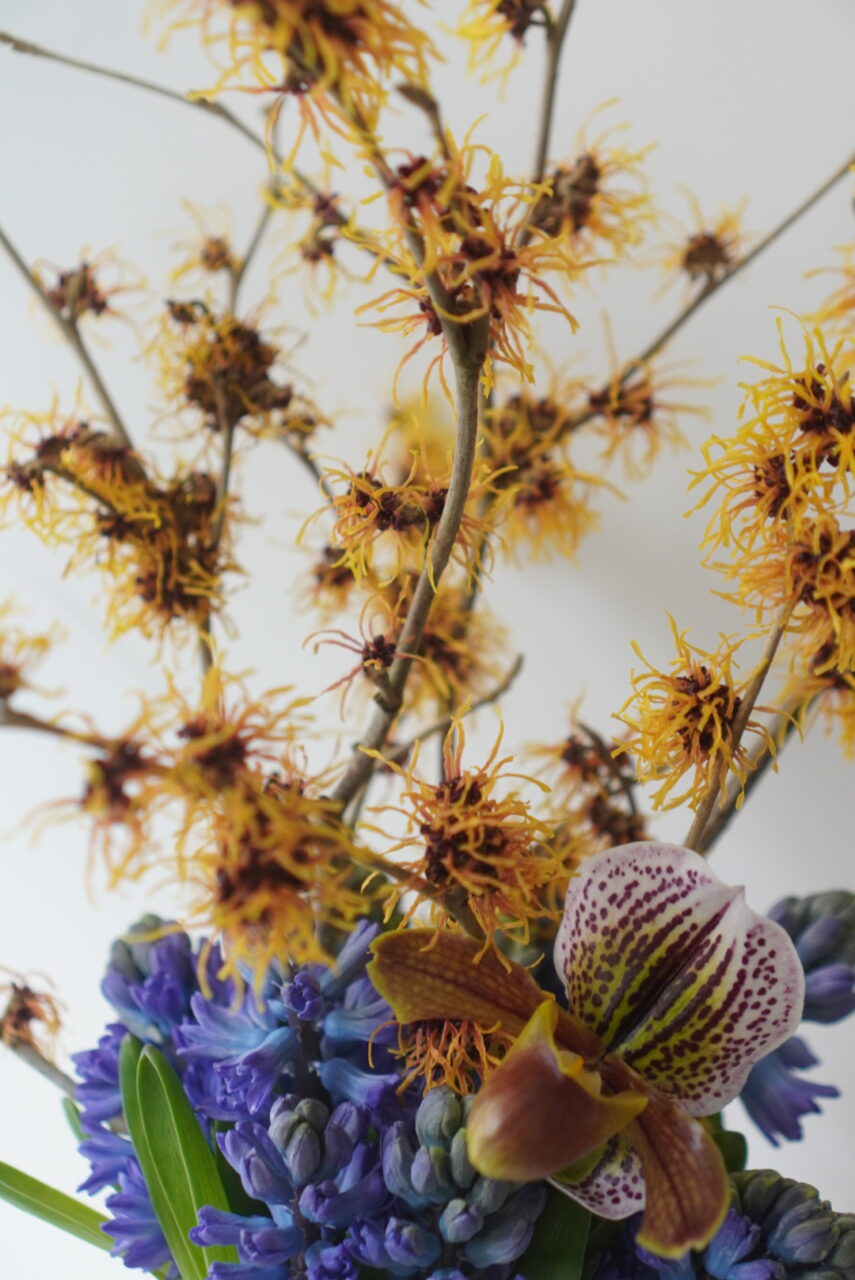 白いチューリップと合わせれば軽やかに、黒いカラーを添えれば表情が引き締まる。ブルーのヒヤシンスを合わせた時の、心が目覚める色のコントラストも楽しい。先日、初めて万作を目にしたというパリジェンヌが珍しそうに顔を近づけて、「甘い匂いがする!」と嬉しそうに発見していた。