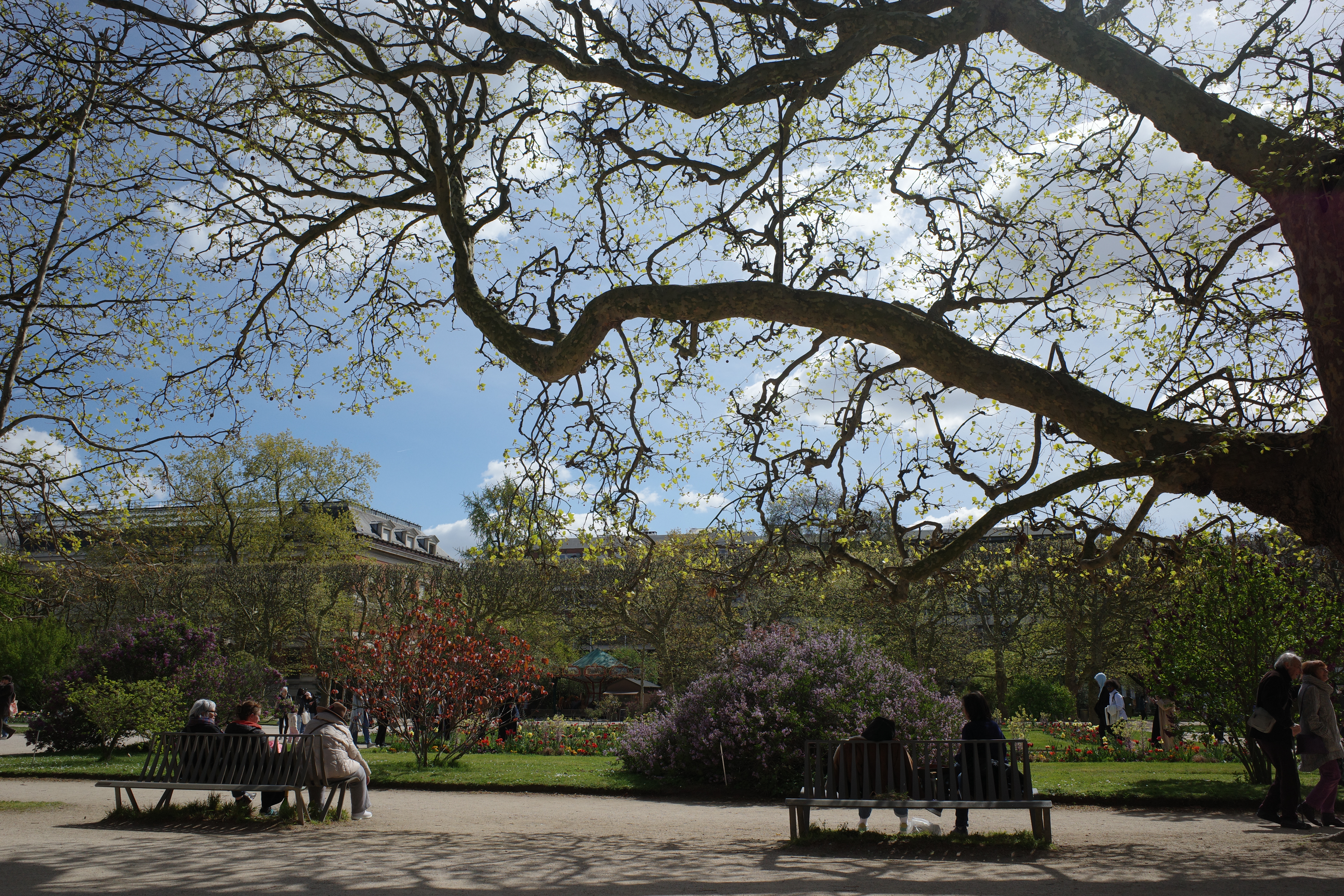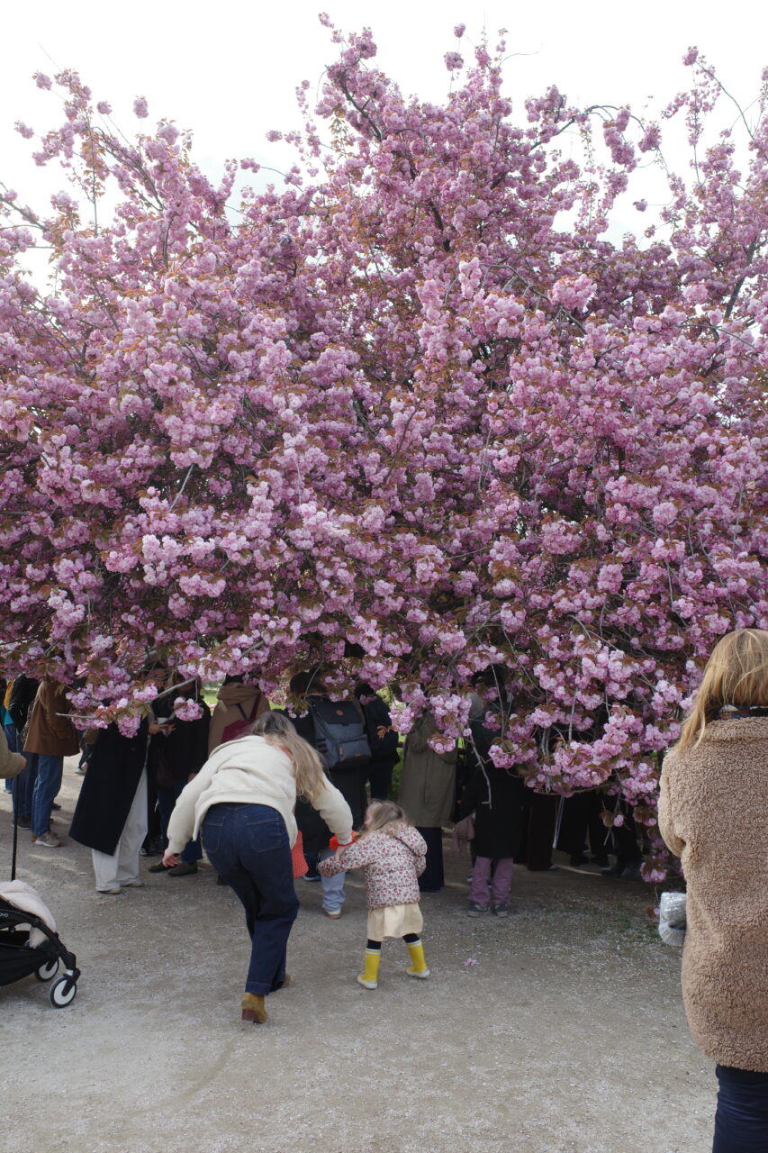進んだ先では、2本の桜の巨木が満開を迎え、人々が集まっている。日本で桜といえばソメイヨシノだが、パリではぽってりしたピンクの八重桜が主流だ。長い冬を抜けて、空の青さが眩しい日曜日、そぞろ歩く人々の表情がみな明るく、喜びに満ちている。園内のベンチは、陽の当たる席から埋まっていく。昼間からワインを飲む人、寝そべる人、ピクニックを楽しむ人も多い。迷いなく春を享受しに出かけ、誰を気にすることもなく謳歌する。この国の、こういう空気が、私はとても好きだ。