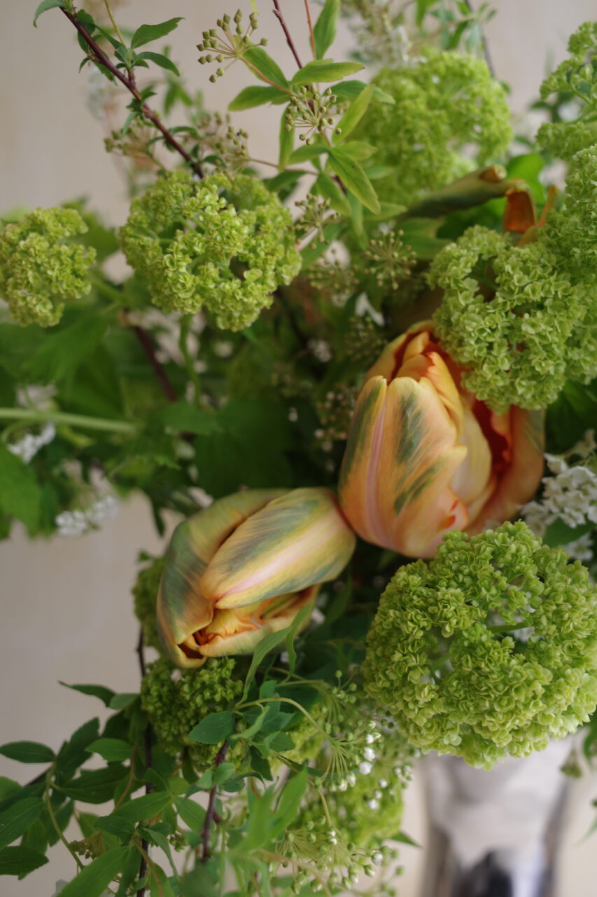 ビバーナムが市場に出てくると、何気なく手に取ってしまう。私にとっては、「パリへの憧れ」を象徴するような花だ。パリのフローリストに憧れ、念願だった研修生時代。食い入るように見つめていたトップフローリストたちの手から生まれるブーケ・シャンペトル。ビバーナムや小手毬といった枝物が、彼らの手にかかれば光と風を味方につけていきいきと踊りだす、まさに魔法だった。気を衒わずとも心に残る、野趣あるブーケは、私にとって、いつまでも美しいと思う原点でもある。ビバーナムの茎をナイフで削いで白いワタを取り除いたり、葉を間引いたりする下処理は研修生の仕事だったが、今振り返れば、それもかなり覚束なかったと思う。フローリストとしても生活者としても赤ちゃんだった、ただひたすら情熱だけを支えに必死だった時代の自分。恥ずかしさで目を覆いたくなるが、痛々しいほど純粋だったし、周りにはいつも手を差し伸べてくれる人がいて、あたたかい場所だった。揺れるビバーナムを前に、あの頃よりもすこしは成長できただろうかと自身に問う。
